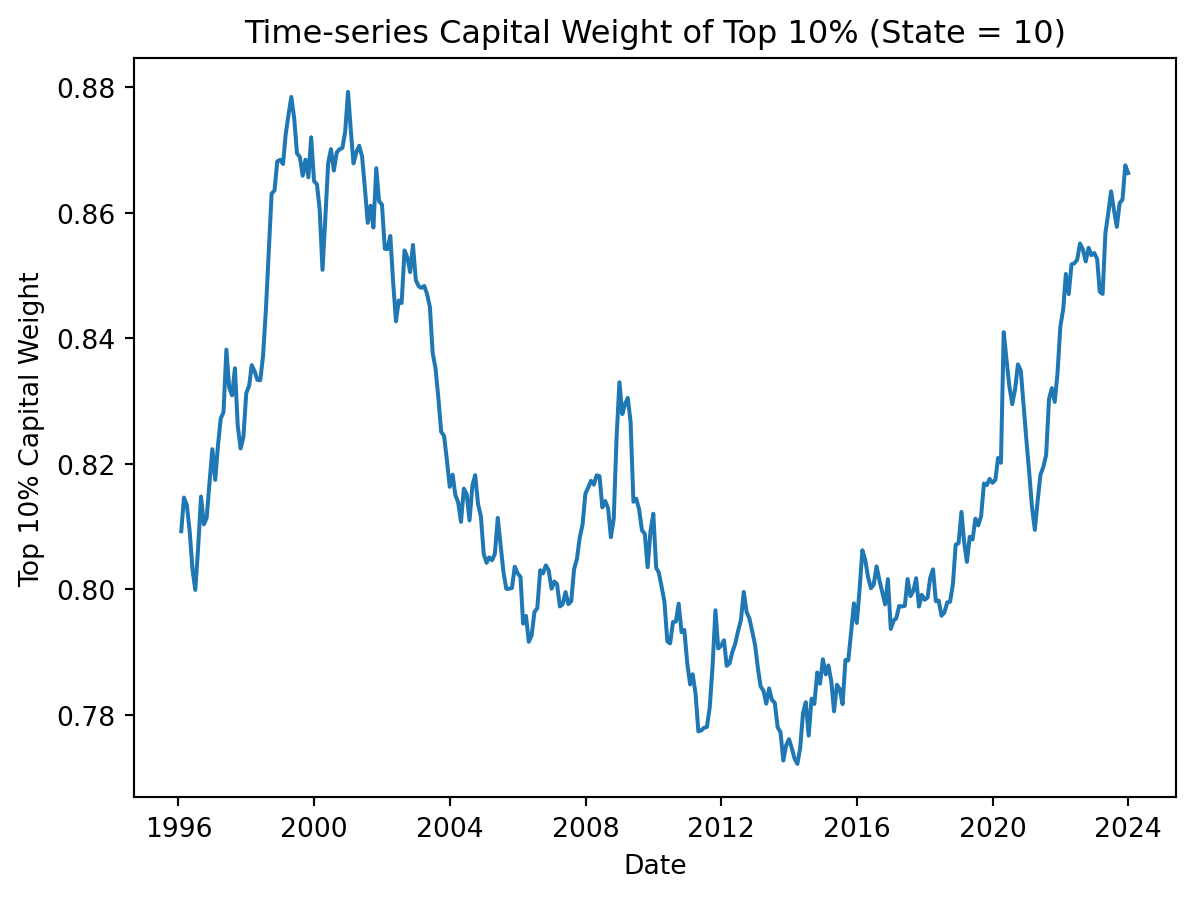 The time-series evolution of \(w_t\)—the value-weighted capital share of the top 10% stocks—offers compelling evidence of persistent and intensifying capital lock-in.