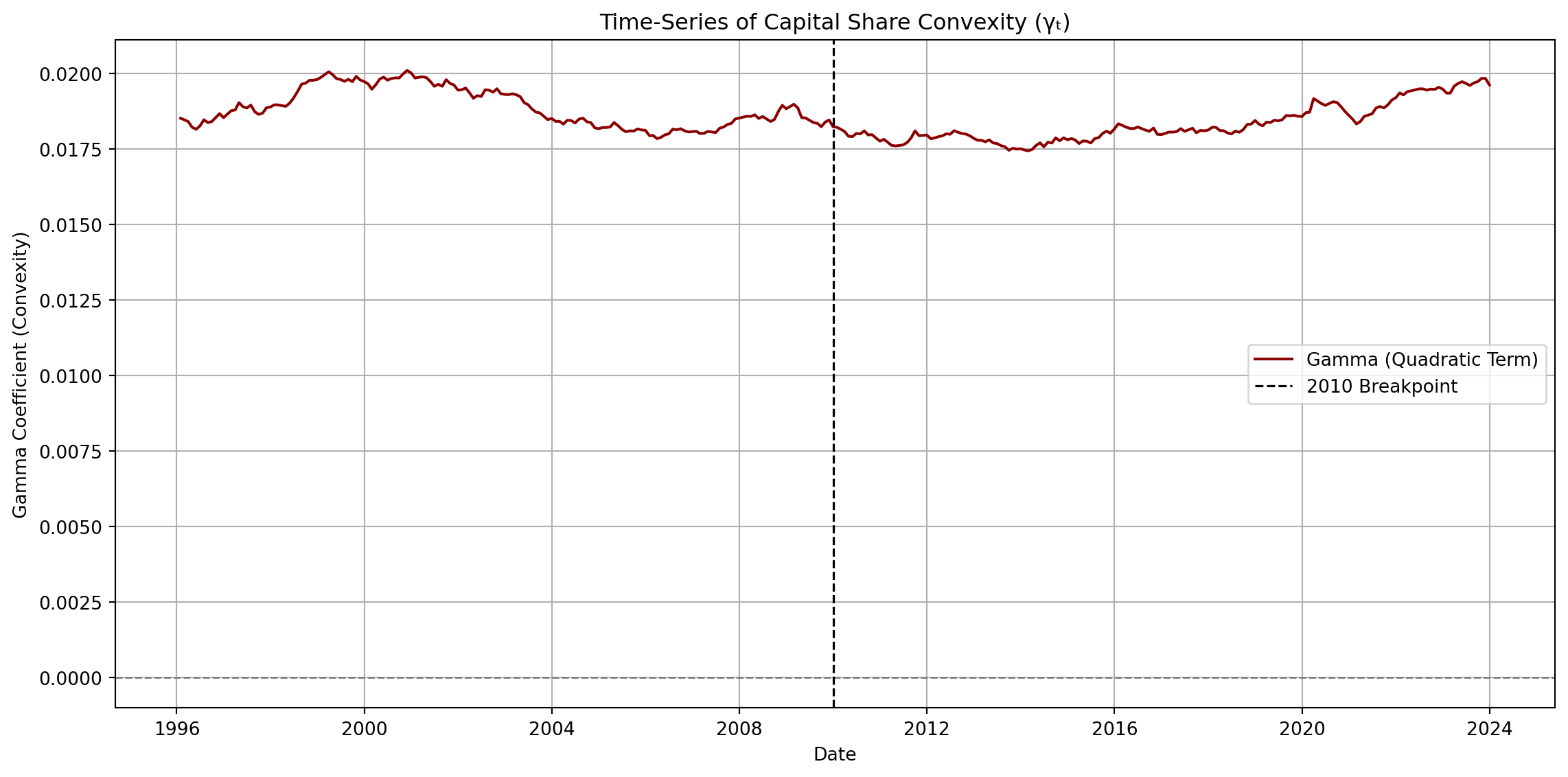 Across the full sample period (1996–2023), \(\gamma_t\) remains consistently positive and tightly bounded, with: