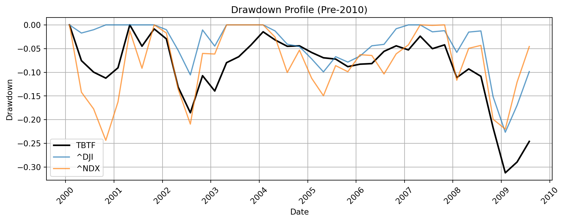 During the first decade, the TBTF strategy underperformed the Dow Jones Industrial Average (^DJI) in terms of drawdown resilience. While TBTF, ^DJI, and ^NDX all exhibited relatively similar patterns prior to the 2008 Global Financial Crisis, the drawdown plot reveals that TBTF experienced a sharper decline during the crisis episode. This suggests that TBTF’s concentrated exposure to the largest-cap firms provided limited diversification benefit during systemic tail events, particularly in contrast to the more balanced composition of the ^DJI.