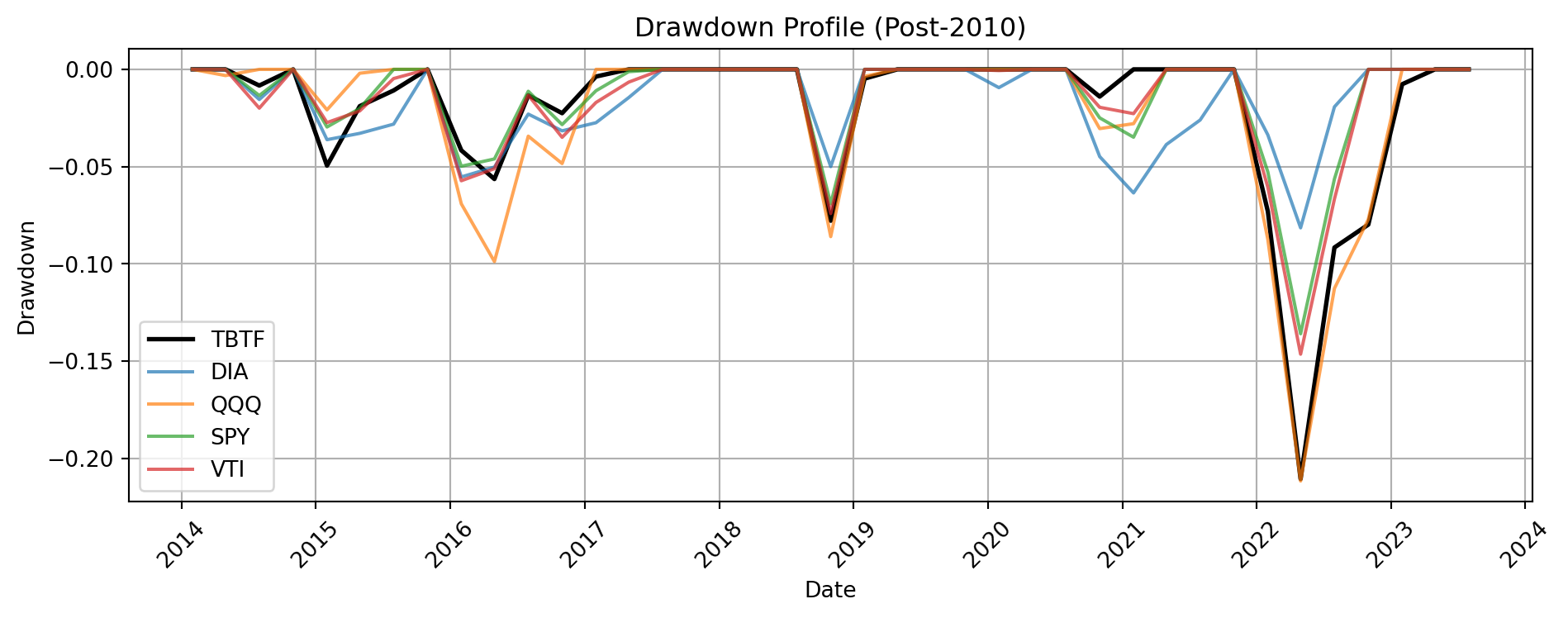 While TBTF suffered deeper losses than ^DJI during the 2008 crisis, its post-2010 drawdown profile proved significantly more resilient than traditional style portfolios and benchmark ETFs, with a rapid recovery trajectory by 2023.