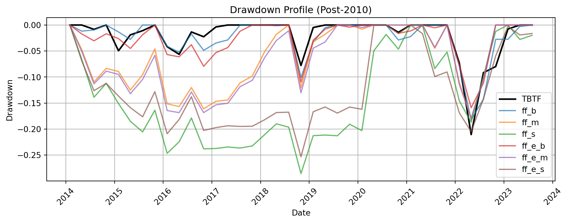 Sharpe and Sortino ratios for TBTF are both negative, indicating that the strategy failed to compensate for volatility and downside risk during this period.