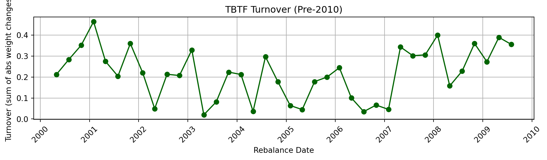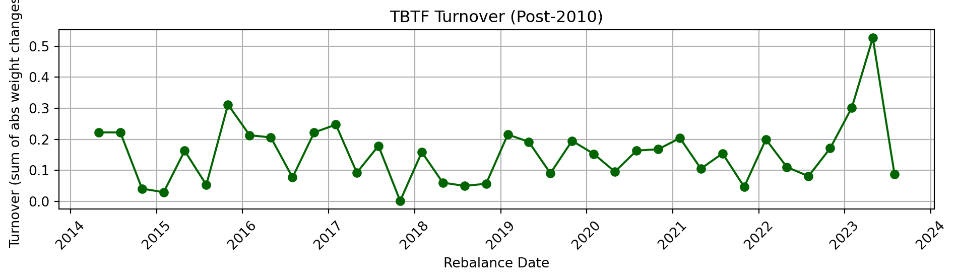 The TBTF strategy rebalances quarterly, yet maintains a remarkably steady turnover profile across both subperiods, highlighting its structural persistence and practical implementability.