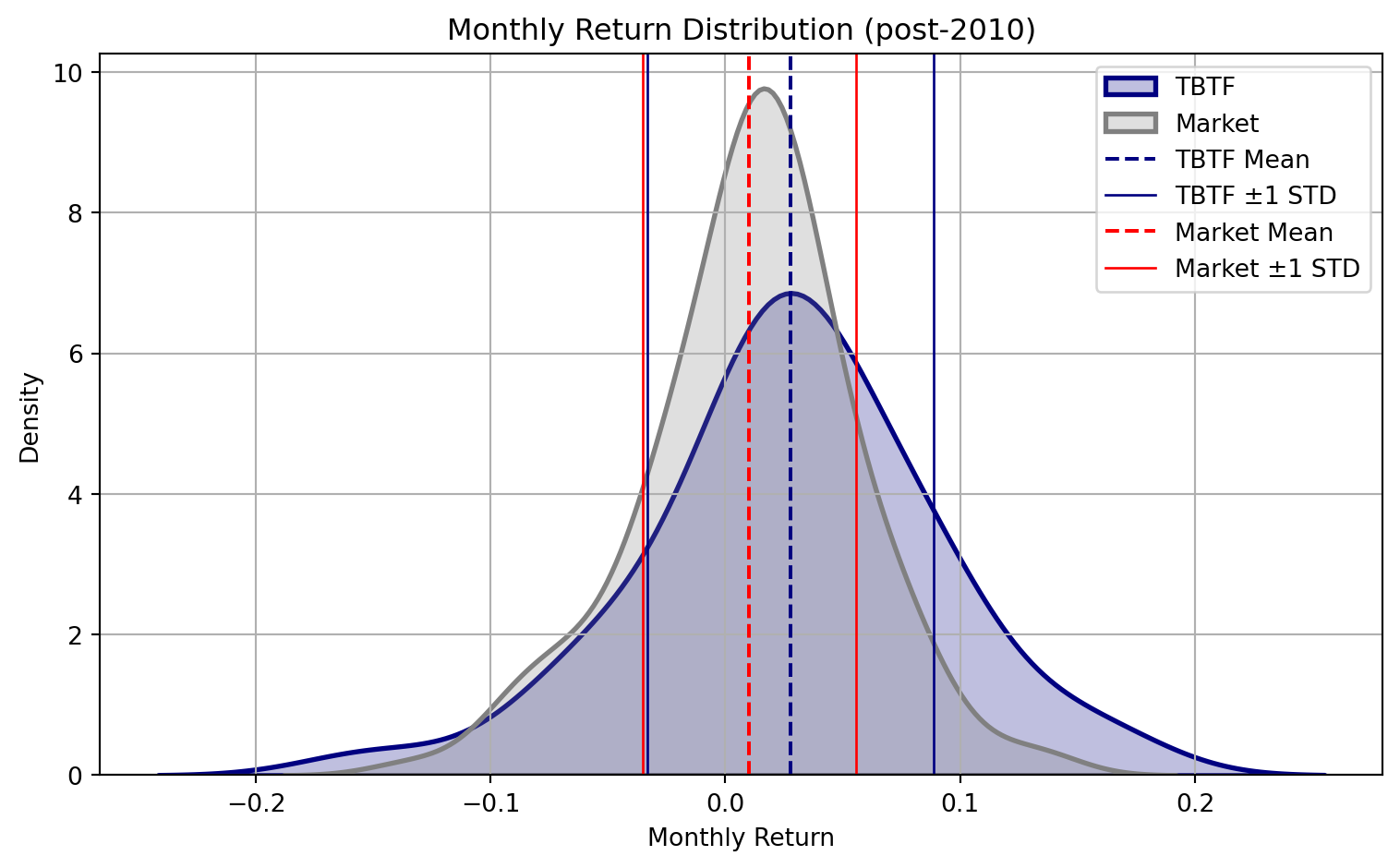 In the post-2010 period, the relationship reverses. While the market portfolio’s standard deviation declines, TBTF not only achieves a higher mean return, but also exhibits superior interquartile positioning—especially in the median and upper quartile. The lower quartile remains similar across both, indicating equivalent downside frequency, but TBTF captures the upside more effectively. In terms of shape, the market distribution becomes more symmetric, whereas TBTF turns left-skewed, reflecting an asymmetric probability mass concentrated just above the loss threshold—consistent with convex return dynamics and infrequent but large outperformance events.