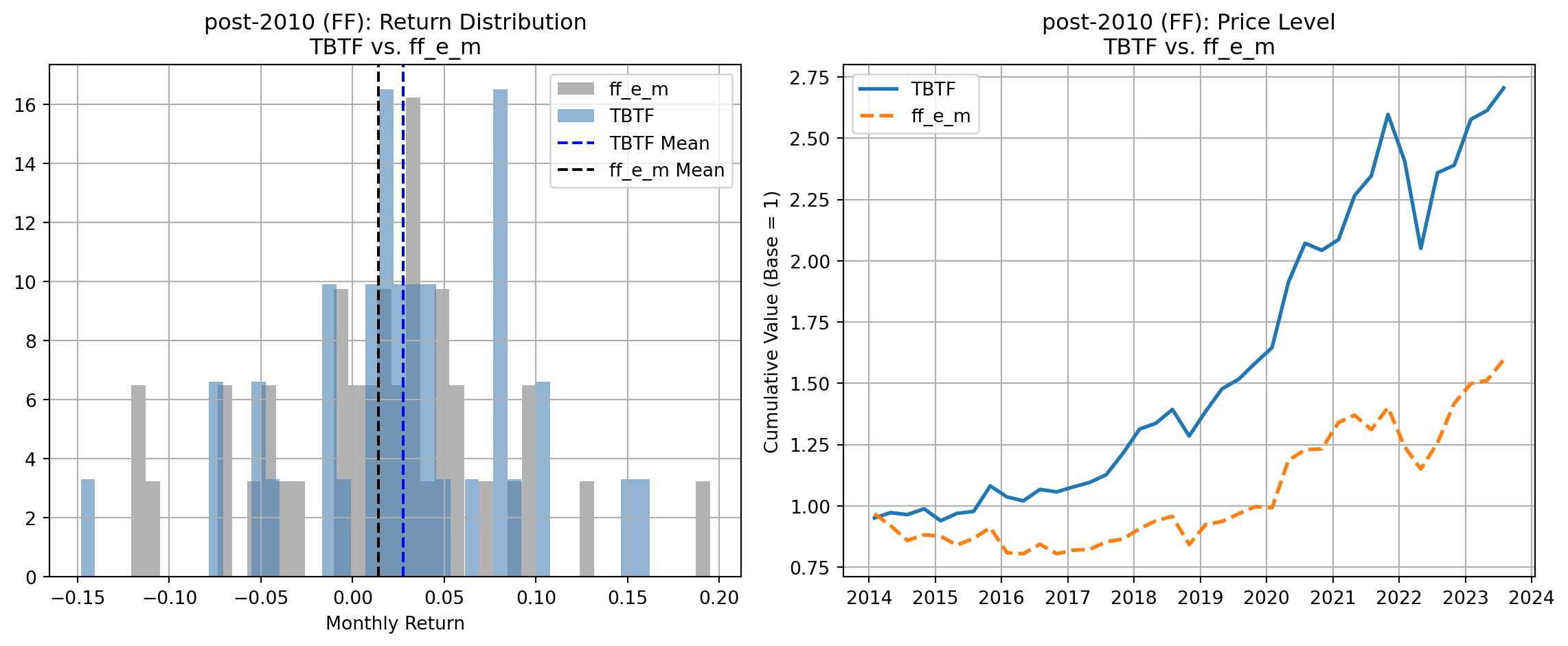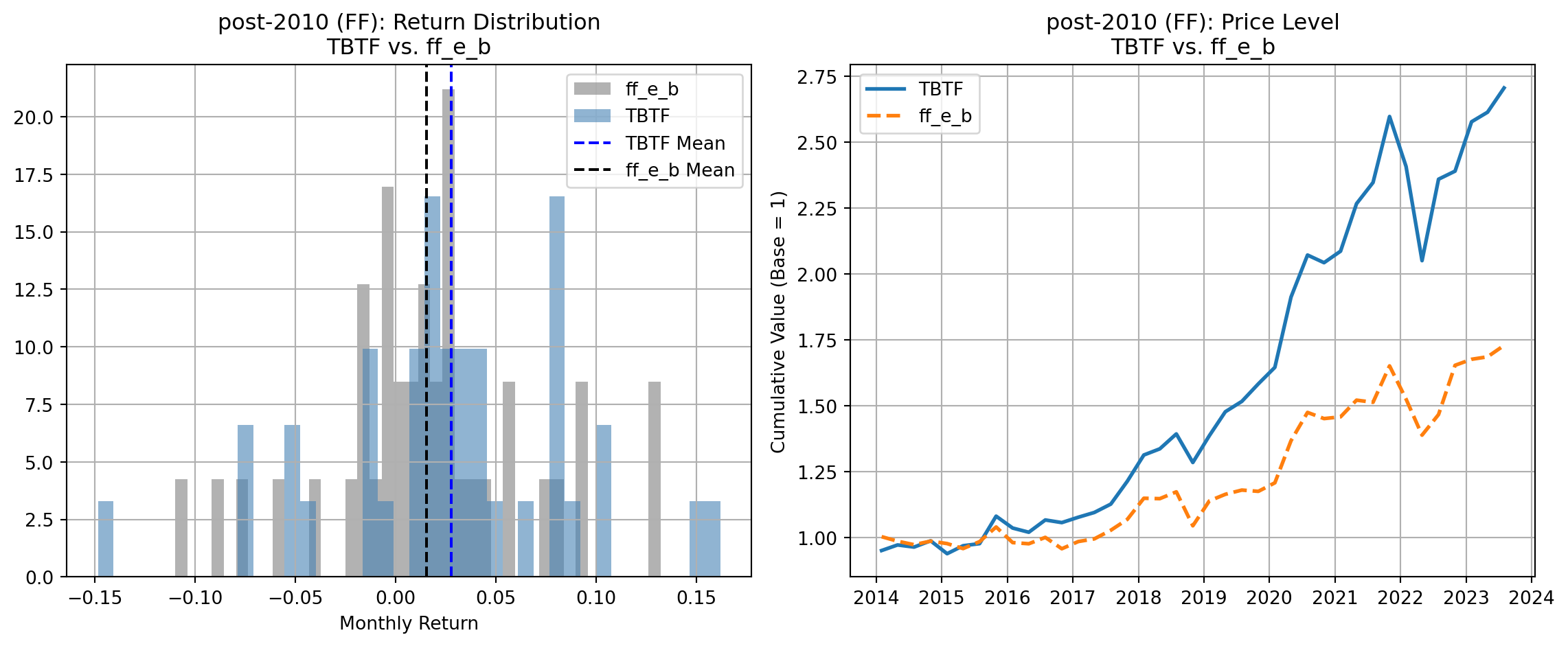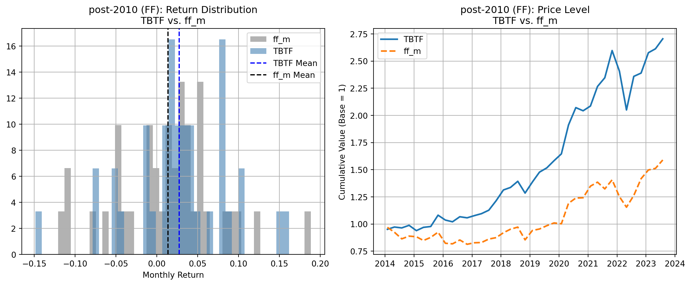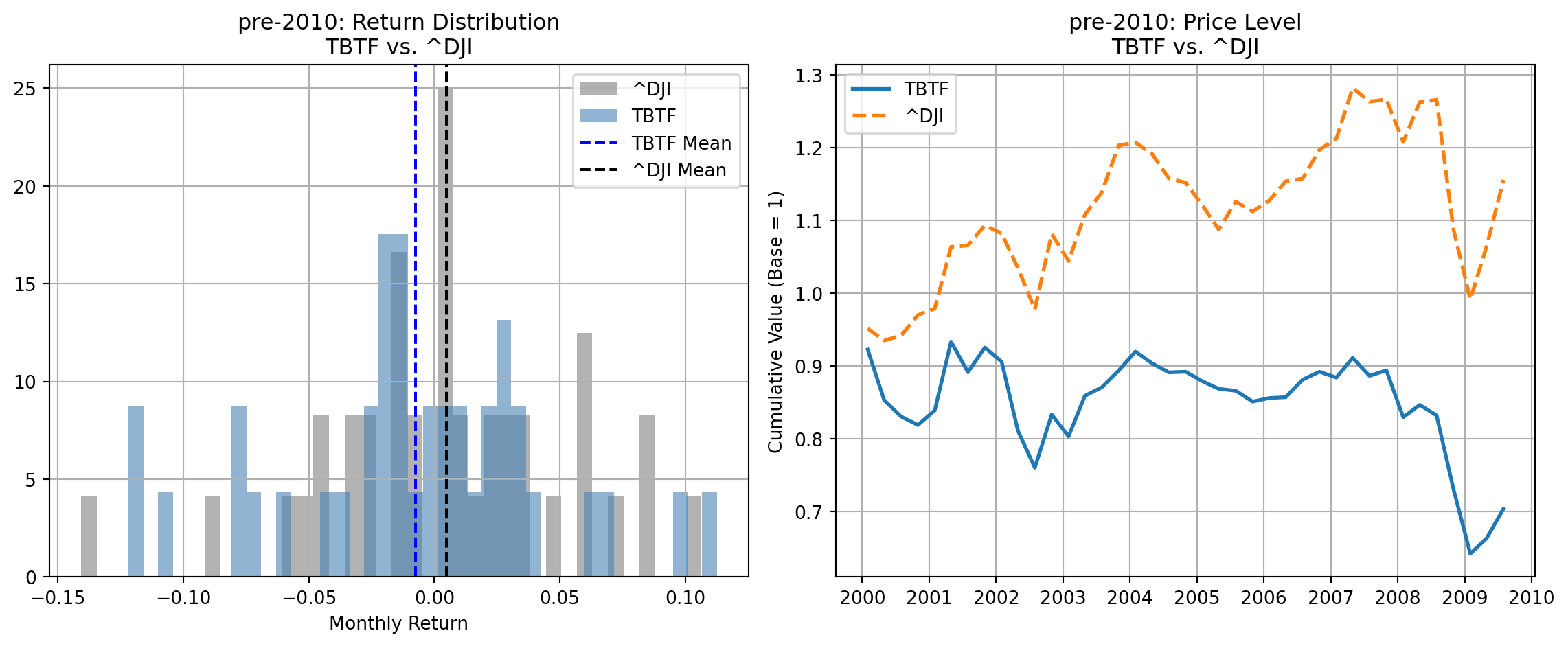 In the pre-2010 sample, TBTF underperforms all major benchmarks both in terms of average monthly returns and cumulative price levels:
