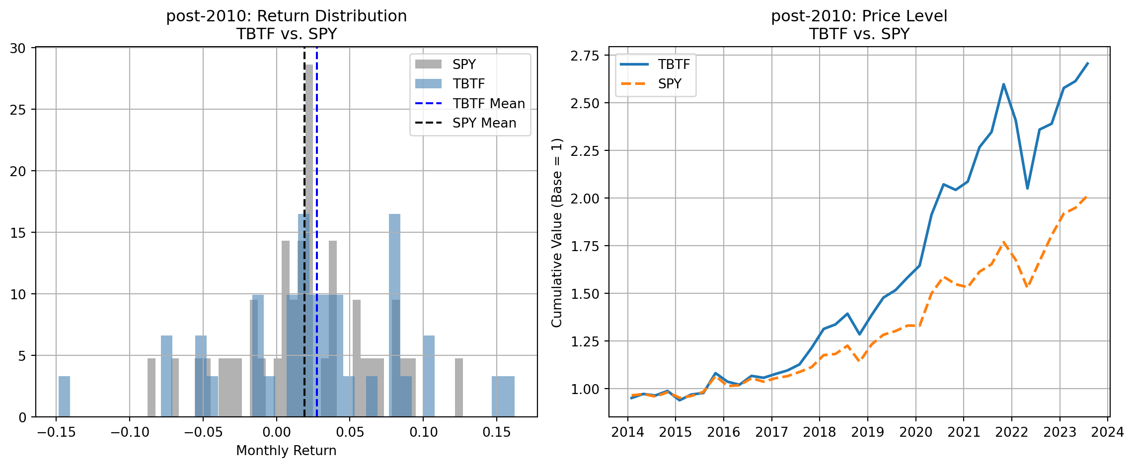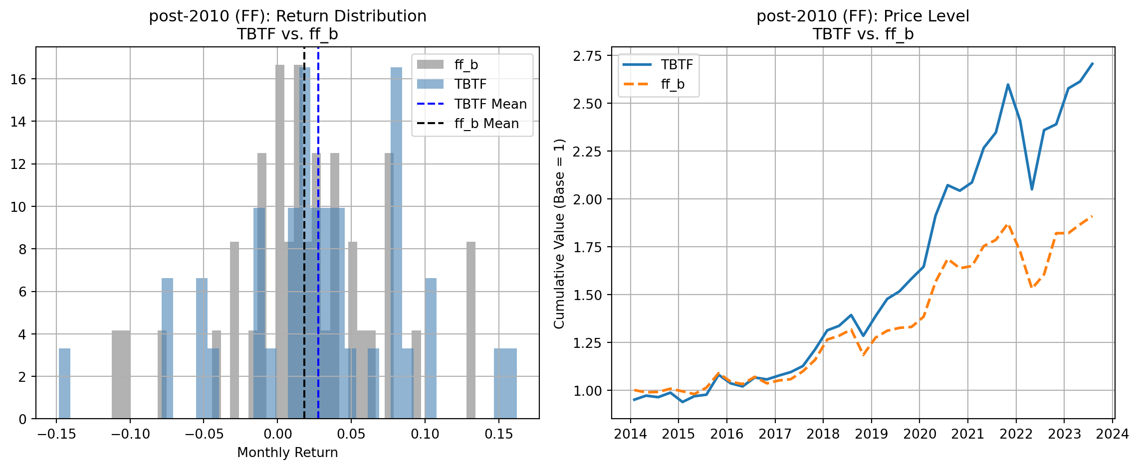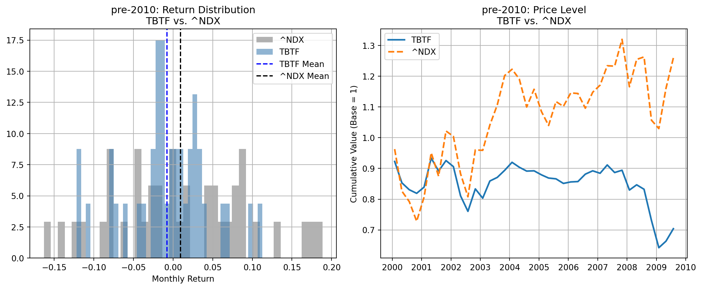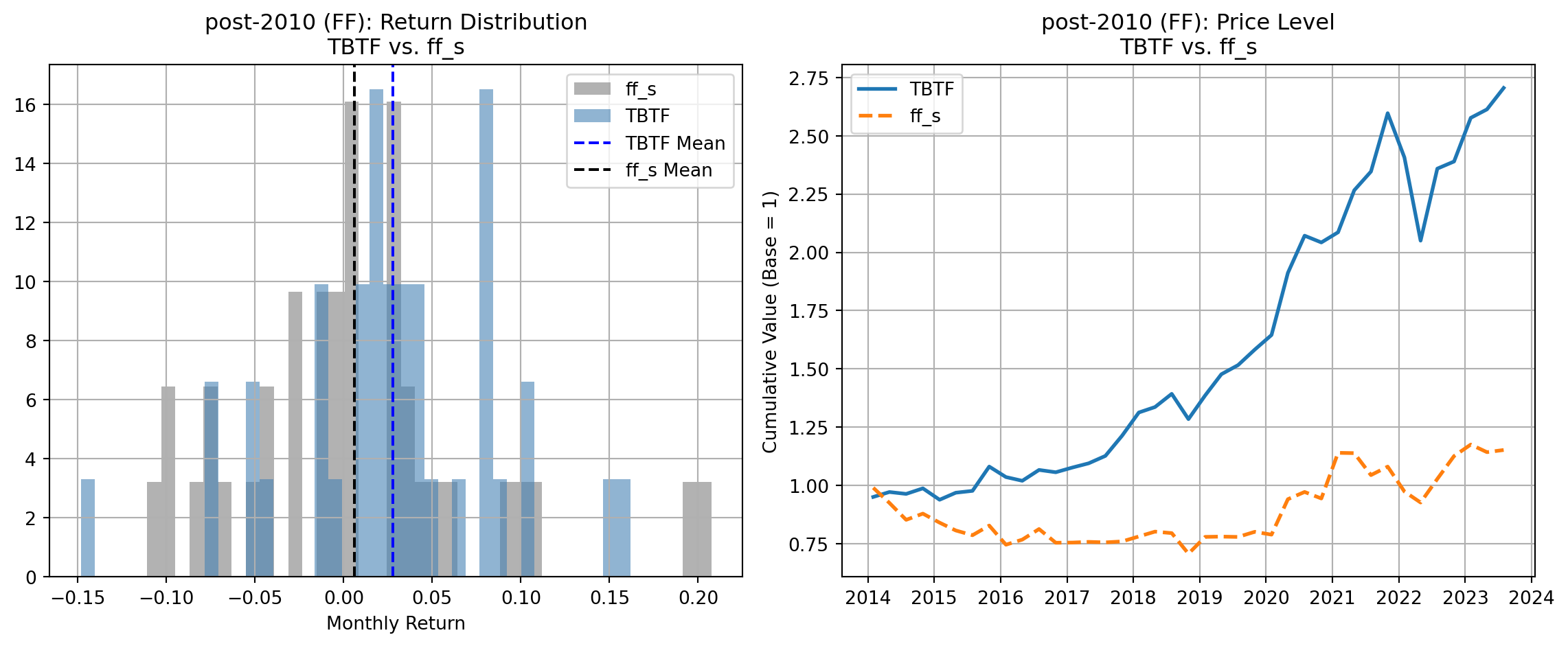In the pre-2010 sample, TBTF underperforms all major benchmarks both in terms of average monthly returns and cumulative price levels: