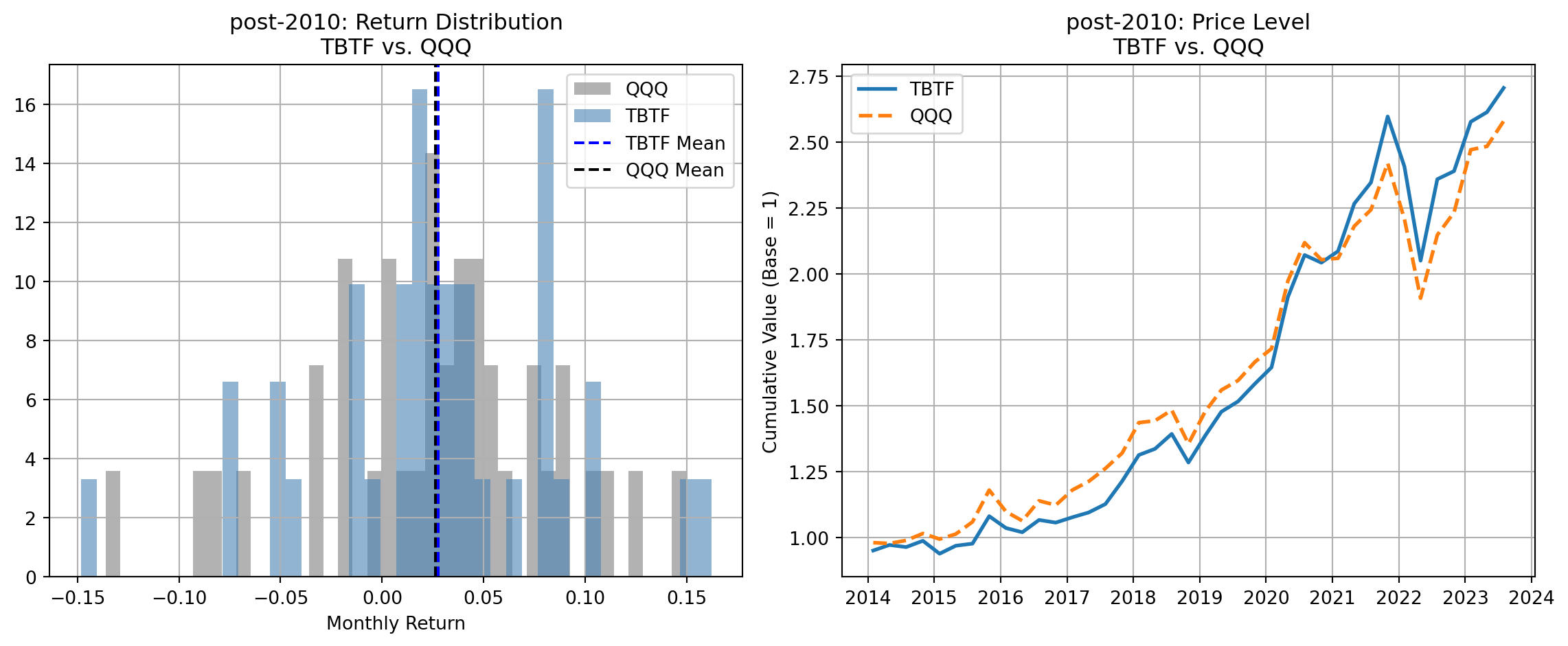 In terms of distribution shape, TBTF displays near-zero skewness and moderate excess kurtosis, suggesting symmetric but fat-tailed returns. This is consistent with the earlier observation that pre-2010 TBTF returns resembled a bell curve with heavy tails, whereas NDX was left-skewed and more extreme in both tails.