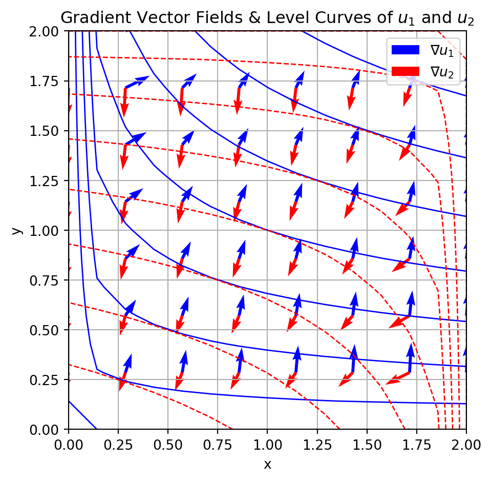 plt.title('Gradient Vector Fields & Level Curves of $u_1$ and $u_2$')