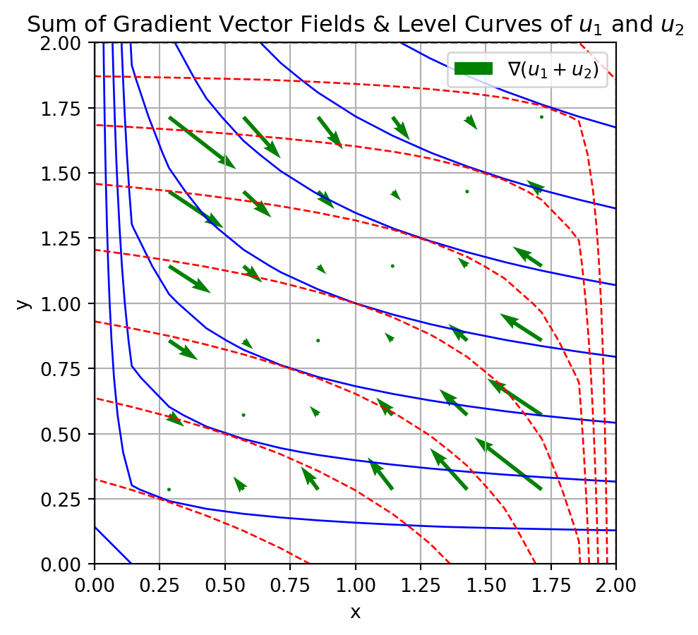 plt.title('Sum of Gradient Vector Fields & Level Curves of $u_1$ and $u_2$')