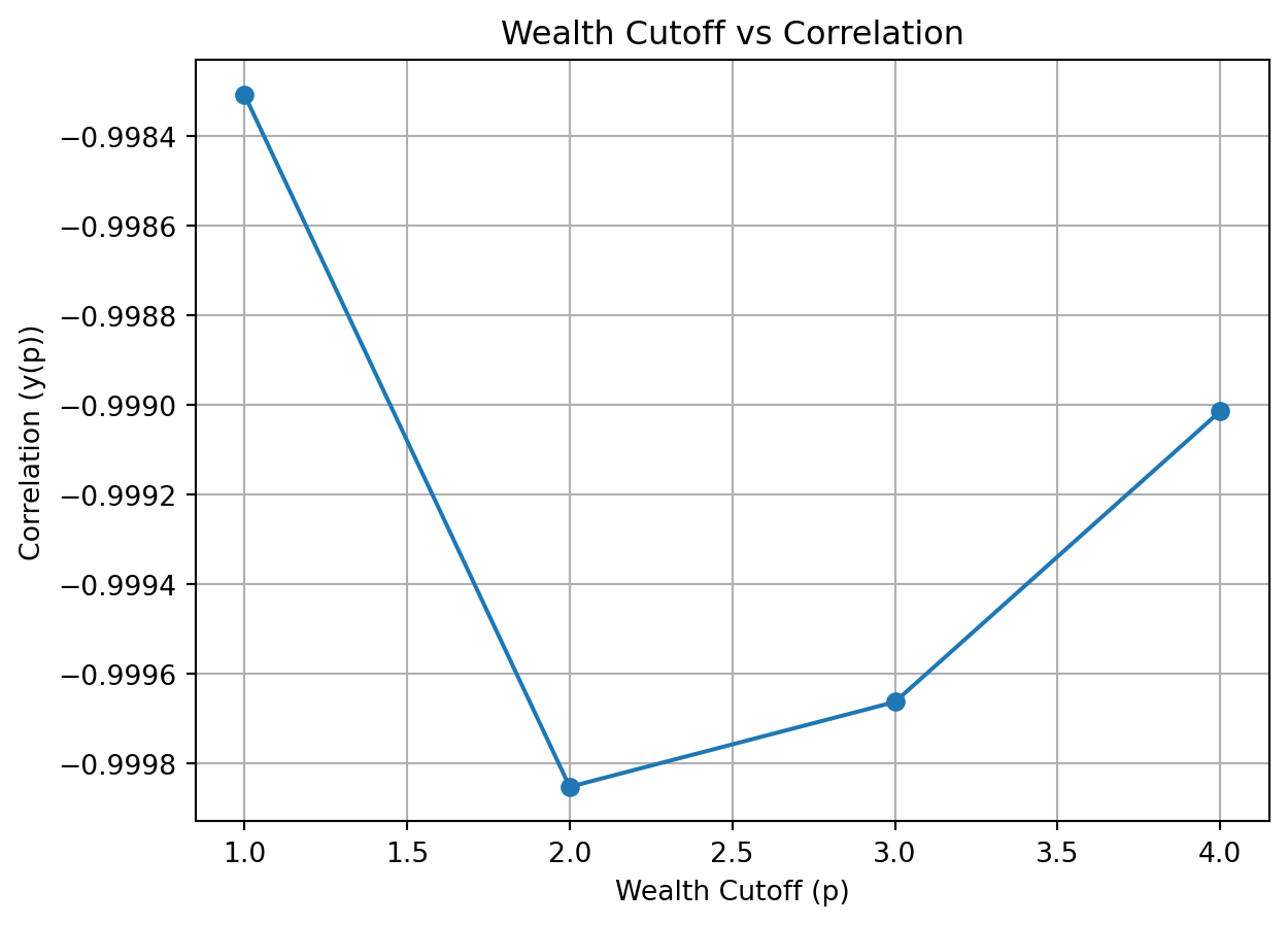 import matplotlib.pyplot as plt# 상관관계 계산 함수def calculate_correlation(a, b):return a.corr(b)# 상관관계 계산correlations = {1: calculate_correlation(data['X_4'] + data['X_3'] + data['X_2'] + data['X_1'], data['X_0']),2: calculate_correlation(data['X_4'] + data['X_3'] + data['X_2'], data['X_1'] + data['X_0']),3: calculate_correlation(data['X_4'] + data['X_3'], data['X_2'] + data['X_1'] + data['X_0']),4: calculate_correlation(data['X_4'], data['X_3'] + data['X_2'] + data['X_1'] + data['X_0'])}# 결과 출력for p, y in correlations.items():print(f"Correlation for p_{p}: {y:.4f}")# 최소 상관관계를 가지는 wealth percentile 찾기min_corr_p =min(correlations, key=correlations.get)percentile_map = {1: "50th", 2: "90th", 3: "99th", 4: "99.9th"}print(f"Minimum correlation is at p_{min_corr_p}: {percentile_map[min_corr_p]}")wealth_date, wealth_level = wealth_levels[min_corr_p]print(f"Wealth level for {percentile_map[min_corr_p]} percentile on {wealth_date.date()}: ${wealth_level:,.0f}")# 그래프 표현p_values =list(correlations.keys())y_values =list(correlations.values())plt.plot(p_values, y_values, marker='o')plt.xlabel('Wealth Cutoff (p)')plt.ylabel('Correlation (y(p))')plt.title('Wealth Cutoff vs Correlation')plt.grid(True)plt.show()