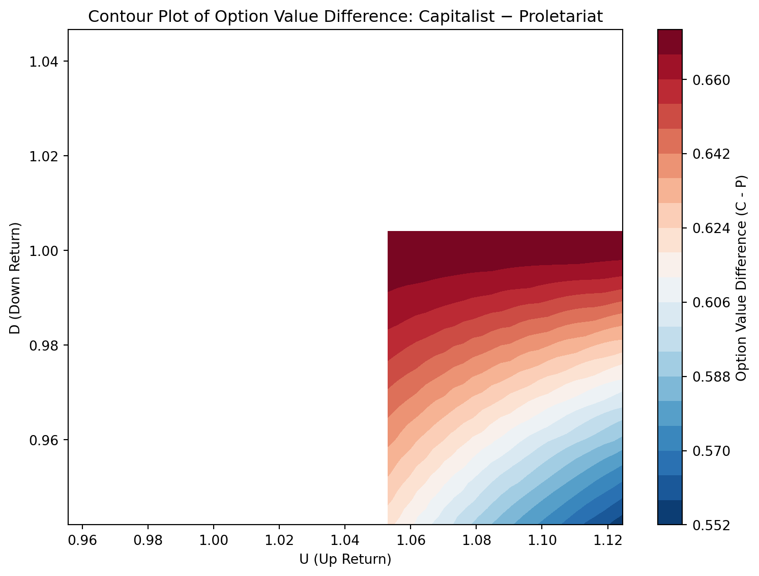 Although a continuous-time limit (e.g., Black-Scholes under \(U \cdot D = 1\)) could be adopted, we retain the discrete binomial structure for its interpretability and ability to directly compare inter-class valuation asymmetries. The model makes transparent how seemingly equal qualifications can yield divergent option values, driven by class-specific capital endowments and asset accessibility.